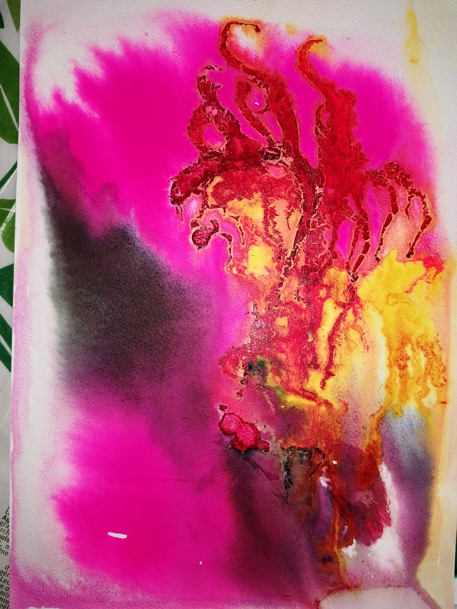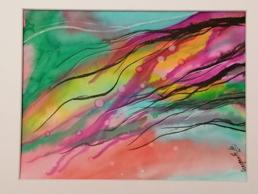L’encre colorée est une technique fluide et expressive qui se caractérise par l’intensité et la transparence de ses couleurs. Elle se travaille par coulures, aplats ou mélanges, laissant souvent une part de hasard dans le résultat. Grâce à sa légèreté et à sa spontanéité, l’encre colorée permet de créer des effets de mouvement, de lumière et de profondeur, donnant aux œuvres un caractère vivant et vibrant.